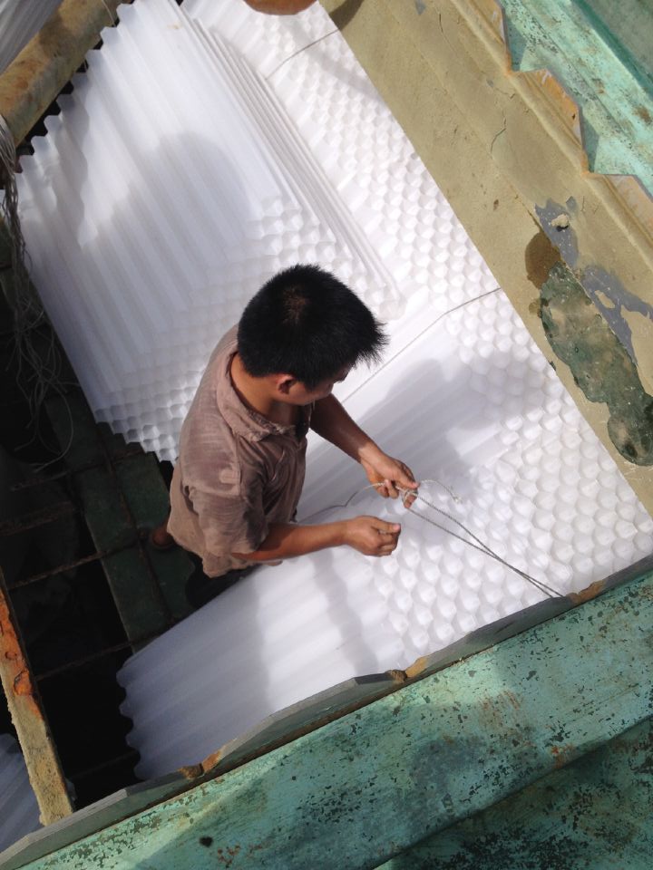 1、打開斜管包裝袋,將第一片斜管平放于地面,取第二片斜管置于第一片之上,檢查斜管切口60°角方向,并呈六角蜂窩狀,無(wú)誤后開始焊接;